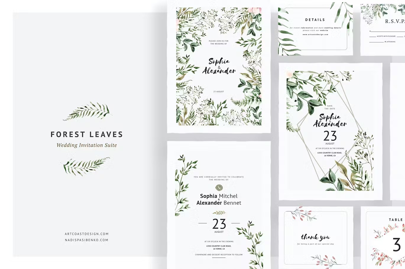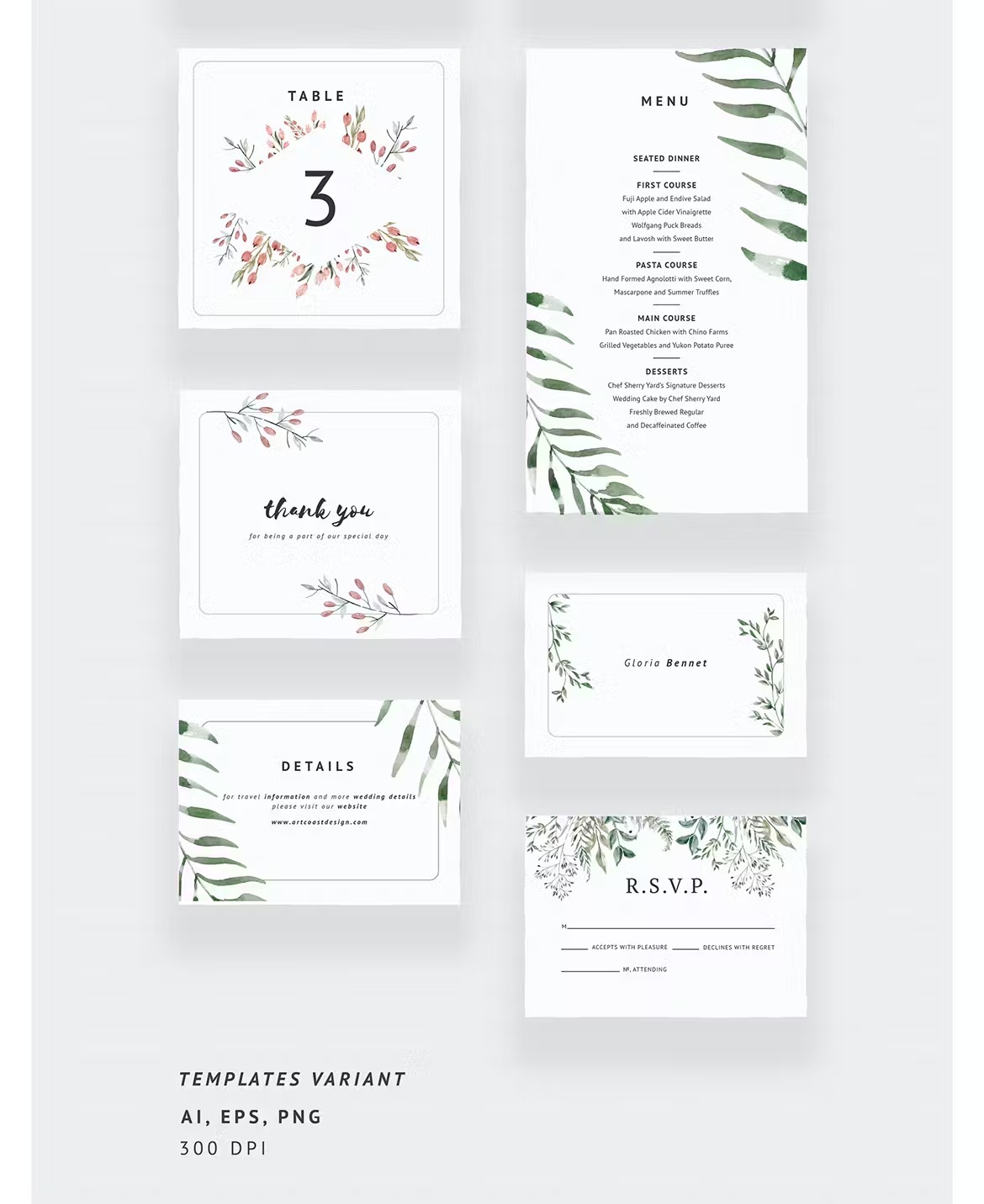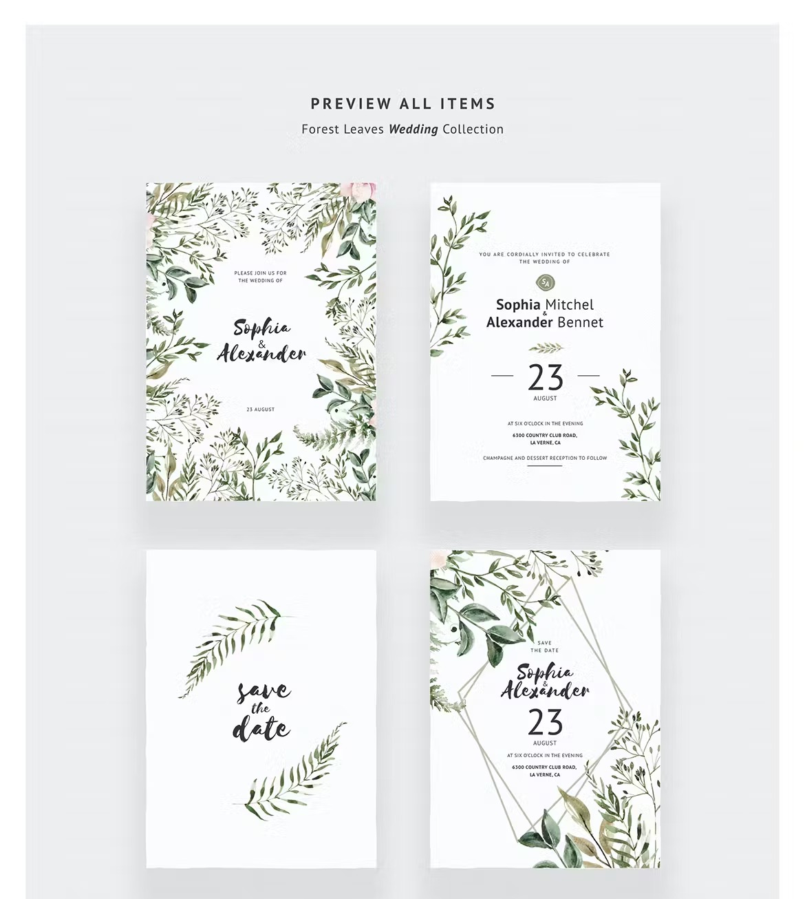 Save the Date 2″ x 7″ Front and Back Invitation 5″ x 7″ Front and Back RSVP Card 5″ x 3.5″ Detail Sheet 5″ x 3.5″ Table Number 5″ x 5″ Thank You Card 5 x 4.25″ Escort Card 5 x 3.25″ Product Features