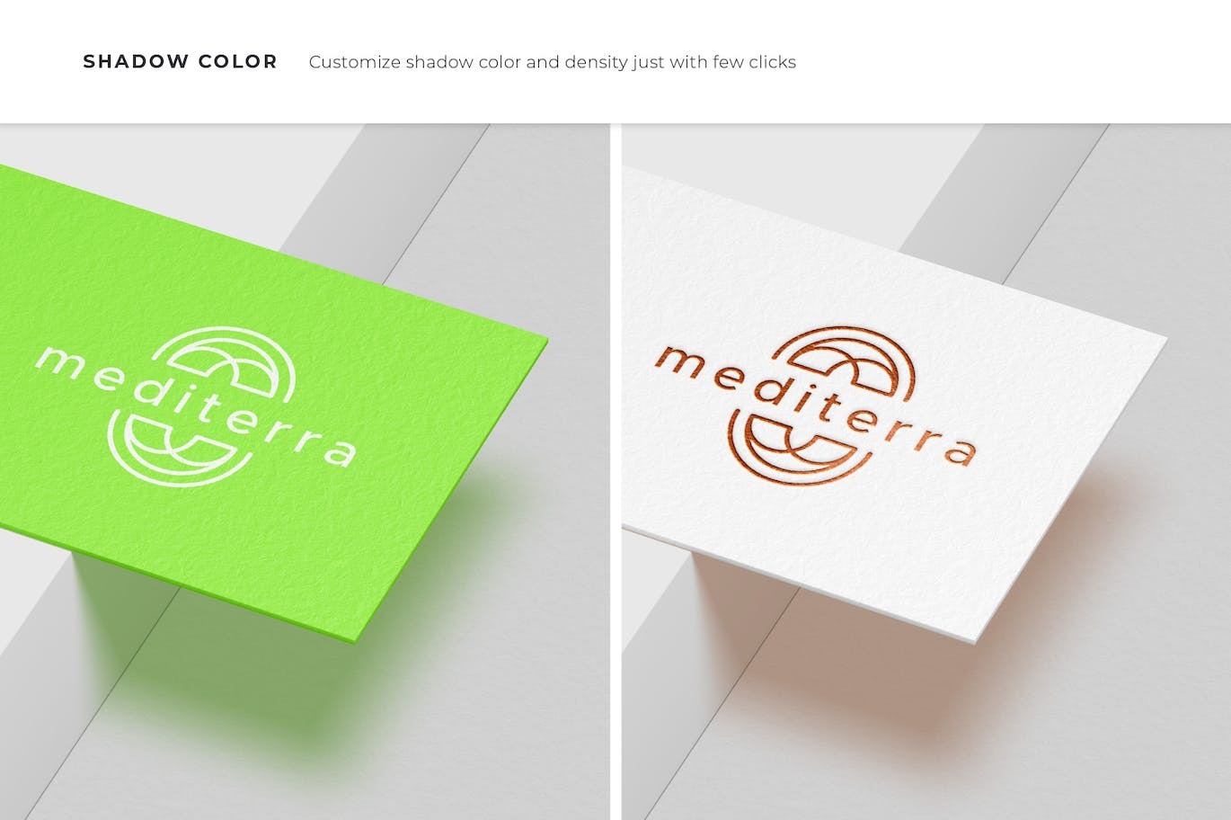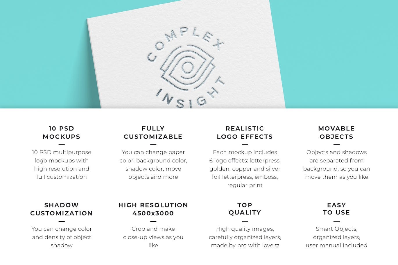 • Realistic Logo effects: each mockup includes 6 Logo effects: letterpress, gold, copper and silver foil, embossed, regular print