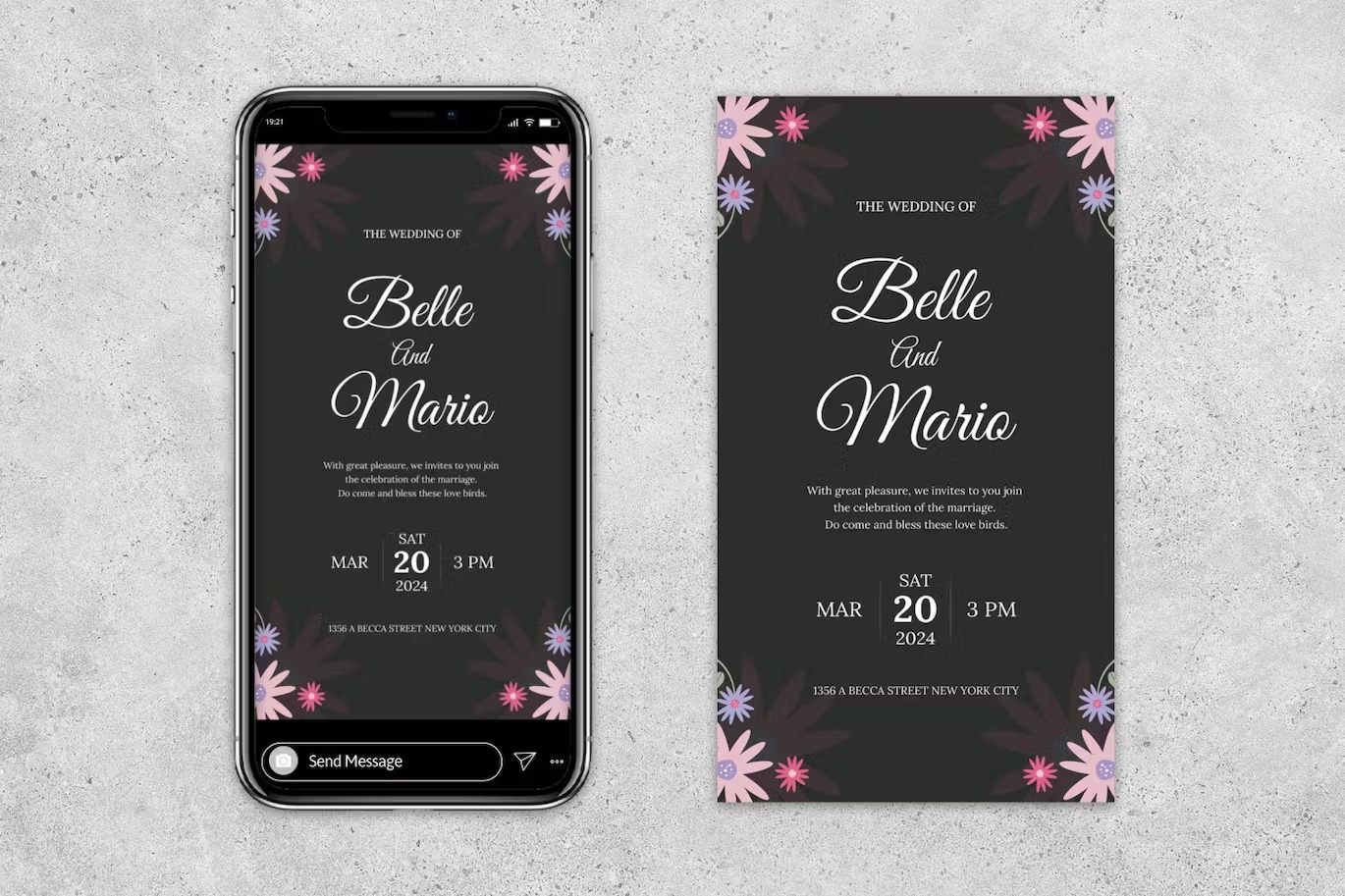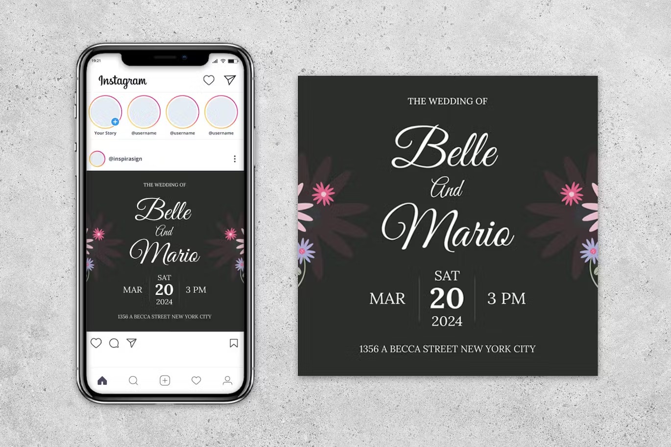 This wedding invitation contains A5 print size, Instagram Feed (1080×1080) and Instagram Story (1080×1920).
